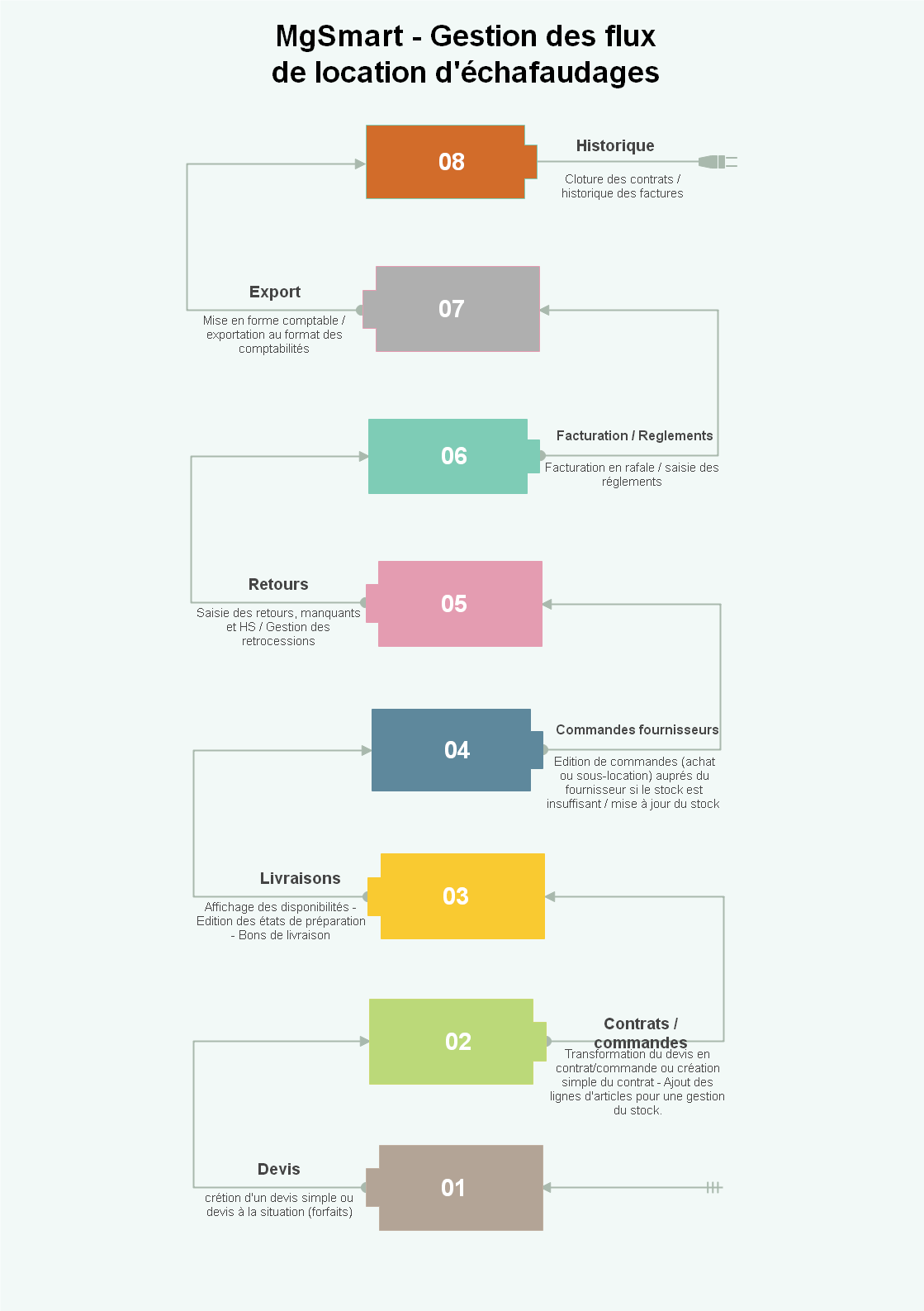 Afin de vous aider, nous avons rédigé une infographie des flux dans un processus de location d’échafaudages.